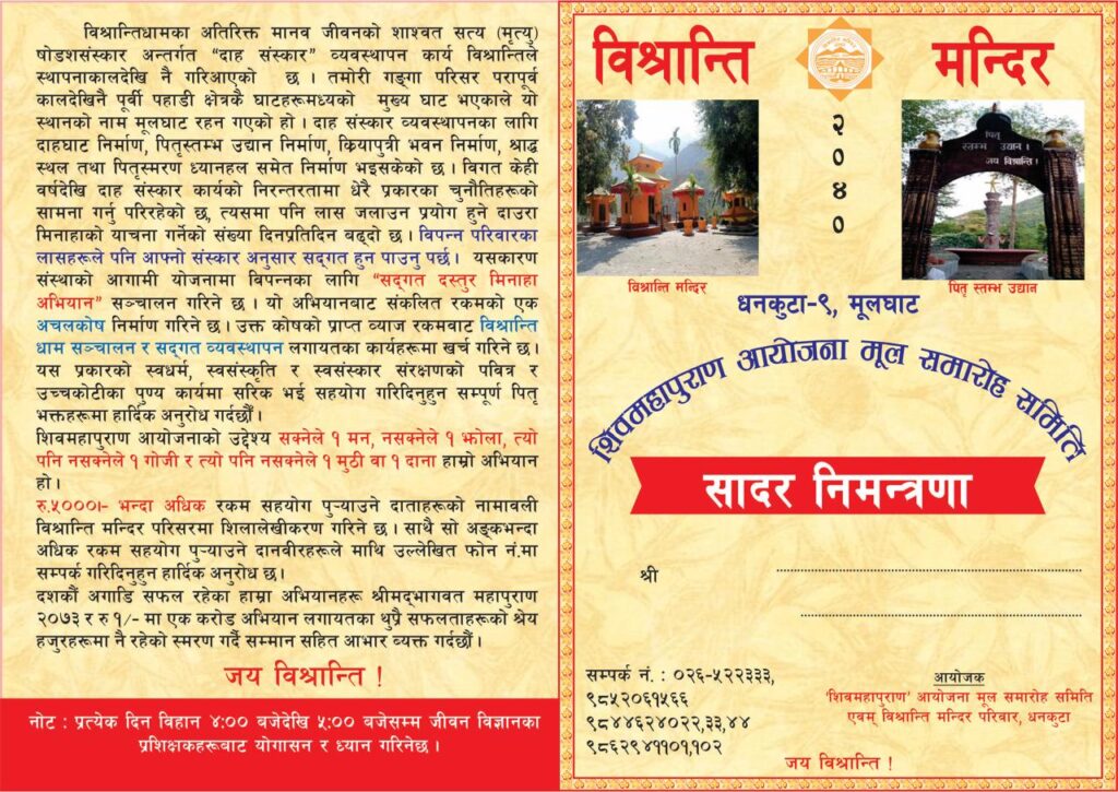 मिति २०८१ फागुन ४ गतेदेखि विश्रान्ति मन्दिर परिसरमा पहिलो पटक शिवमहापुराणको आयोजना भएको छ । यहाँहरू सम्पूर्ण विश्रान्तिप्रेमी भक्तहरूलाई हार्दिक निमन्त्रणा छ ।
