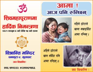 मिति २०८१ फागुन ४ गतेदेखि विश्रान्ति मन्दिर परिसरमा पहिलो पटक शिवमहापुराणको आयोजना भएको छ । यहाँहरू सम्पूर्ण विश्रान्तिप्रेमी भक्तहरूलाई हार्दिक निमन्त्रणा छ ।